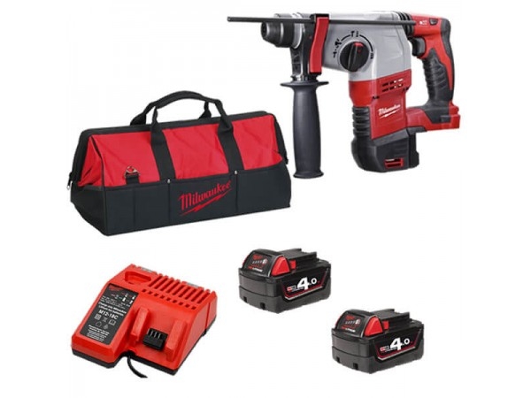 Martelo combinado SDS-Plus M18, 4 modos, 2,4J de energia de impacto, capacidade máxima 24mm, vibração em cinzelagem 7,4m/s², 4.200ipm. Fornecido com 2 baterias M18B4 e carregador M12-18C, em kitbox