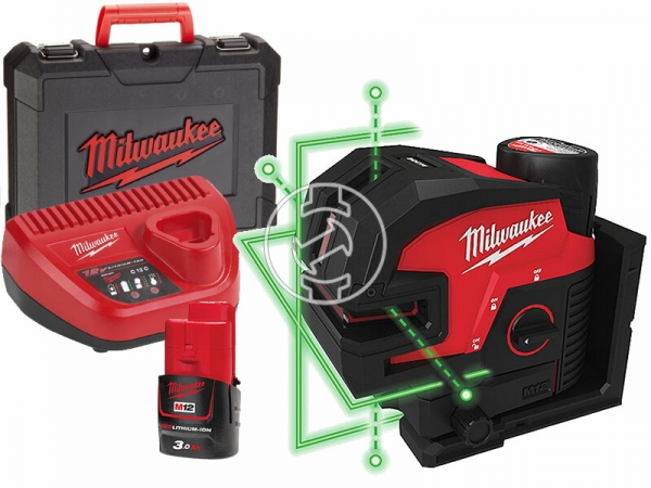 NÃvel laser de 2 linhas e 4 pontos M12, verde, micro ajuste, classificação IP54. Inclui pinça para tetos falsos e placa de alta visibilidade. Fornecido com 1 bateria M12B3 e carregador C12C, em kitbox