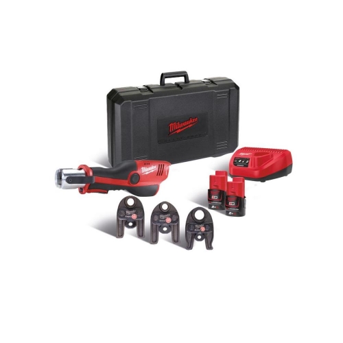 Prensadora hidráulica subcompacta M12 FORCE LOGIC, força de prensagem 19kN, 4.0000 ciclos de prensagem entre manutenções, capacidade máxima 35mm em metal e 40mm em plástico. Inclui 3 garras TH 16, 20 e 32mm. Fornecido com 2 baterias M12B2 e carregador C12C, em kitbox