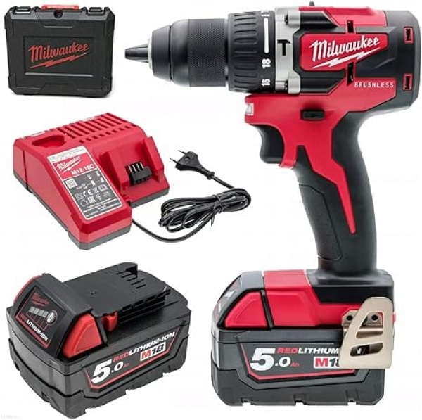 Berbequim com percussão compacto sem escovas M18?, 2 velocidades, torque máximo 60,5Nm, bucha metálica 13mm, comprimento total 145mm. Fornecido com 2 baterias M18B5 e carregador M12-18C, em kitbox