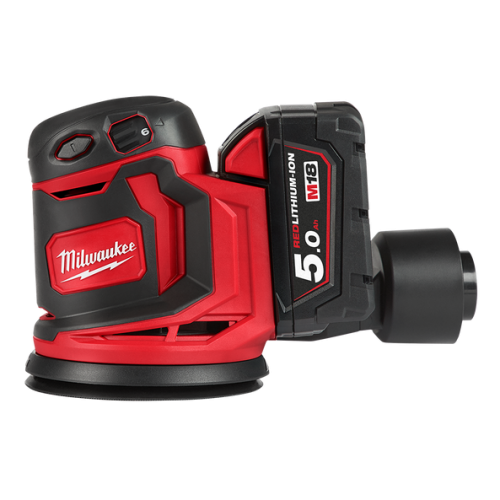Lixadora rotorbital M18, diâmetro de lixa 125mm, 1.2000rpm, 14.000-24.000opm, 2,4mm de oscilação. Fornecido com 2 baterias M18B5 e carregador M12-18C, em bolsa de transporte