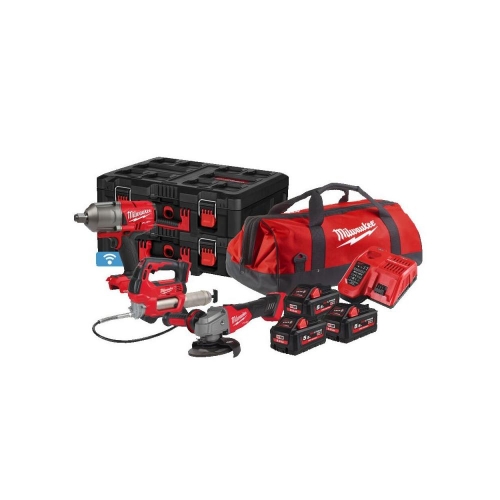 M18ONEFHIWF34 + M18GG + M18FSAG125X. Fornecido com 3 baterias HIGH OUTPUT M18HB5.5 e carregador rápido M12-18FC, em 2 malas PACKOUT e 1 bolsa de transporte