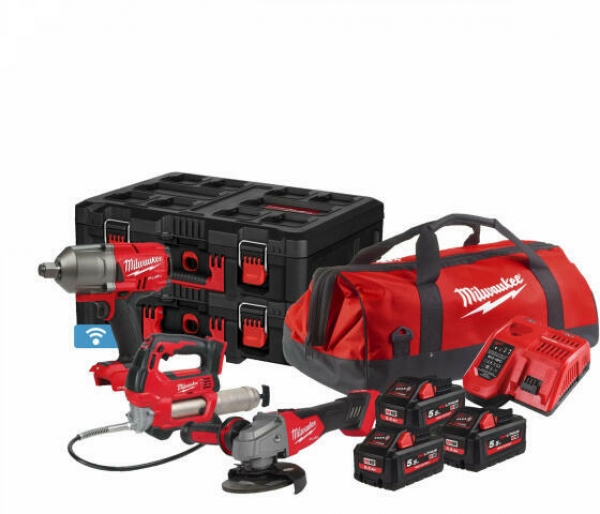 M18FPD2 + M18FHX + M18FMTIW2F12 + M18FSAG125X. Fornecido com 3 baterias HIGH OUTPUT M18HB5.5 e carregador rápido M12-18FC, em caixa com rodas PACKOUT