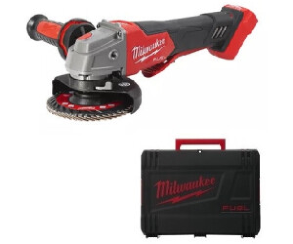 Rebarbadora de acabamentos M18 FUEL, diâmetro de disco 125mm, travão RAPIDSTOP, velocidade variável de 5 posições, 3.500-8.500rpm, AVS, FIXTEC, proteção antigolpe, interruptor de alavanca, DMS. Inclui resguardo para corte adicional. Fornecido em versão zero, sem baterias nem carregador, em HD-box
