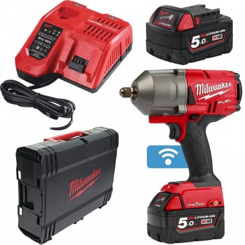 Chave de impacto de alto torque M18 FUEL ONE-KEY, encabadouro 1/2" com pino, 4 modos, torque máximo de aperto 1.071Nm,torque máximo de desaperto 1.491Nm. Fornecido com 2 baterias M18B5 e carregador rápido M12-18FC, em HD-box
