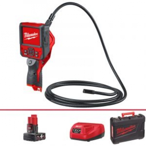 Câmara de inspeção M12, diâmetro de cabo 12,4mm, diâmetro de cabeçal 12mm, comprimento de cabo 2,7m, tamanho ecrã 85mm, ecrã desmontável, zoom 4x e rotação de imagem, 4 LED´s envolventes. Inclui cabo de 2,7m e cartão SD 8GB. Fornecida com 1 bateria M12B2 e carregador C12C, em bolsa de transporte