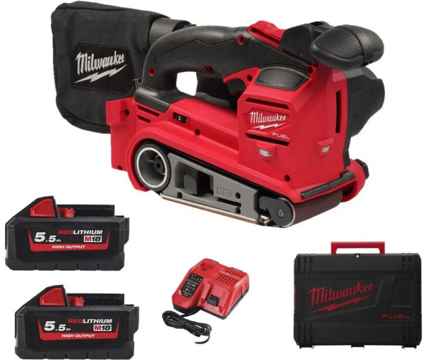 Lixadora de rolos M18 FUEL, velocidade variável 230-410m/min, superfÃcie de polimento 90x135mm, largura da cinta 75mm, comprimento da cinta 457mm, compatÃvel com sistema de aspiração DEK26, pega frontal ajustável sem ferramentas, iluminação LED dupla. Inclui bolsa de recolha de poeiras e 1 lixa de cinta. Fornecido com 2 baterias HIGH OUTPUT M18HB5.5 e carregador rápido M12-18FC, em HD-box