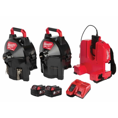 Desentupidora M18 FUEL, espiral de 16mm de diâmetro, comprimento de cabo 15m, diâmetro máximo de tubo 110mm. Inclui 2 tambores de 16mm x 15m de comprimento e 1 conjunto de lâminas e ferramenta de extracção. Fornecido com 2 baterias M18B5 e carregador rápido M12-18FC