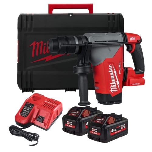 Martelo combinado SDS-Plus M18 FUEL ONE-KEY, 4 modos, 5J de energia de impacto, capacidade máxima 32mm, 0-800rpm, 0-4.600ipm, FIXTEC, AUTOSTOP. Fornecido com 2 baterias HIGH OUTPUT M18HB5.5 e carregador rápido M12-18FC, em HD-box