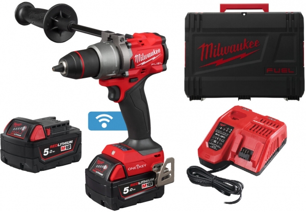 Berbequim com percussão M18 FUEL? ONE-KEY?, 2 velocidades, torque máximo 158Nm, bucha metálica 13mm, embraiagem mecânica, AUTOSTOP?, comprimento total 175mm. Fornecido com 2 baterias M18B5 e carregador rápido M12-18FC, em HD-box