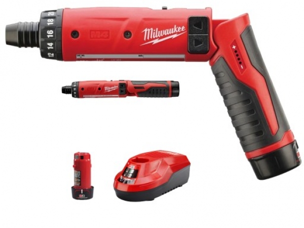 Aparafusadora M4, encabadouro 1/4" hex, torque máximo 5Nm, 2 velocidades - 0-200/0-600rpm, pega com 2 posiçõess. Fornecido com 2 baterias M4B2 e carregador M4C, em bolsa de transporte